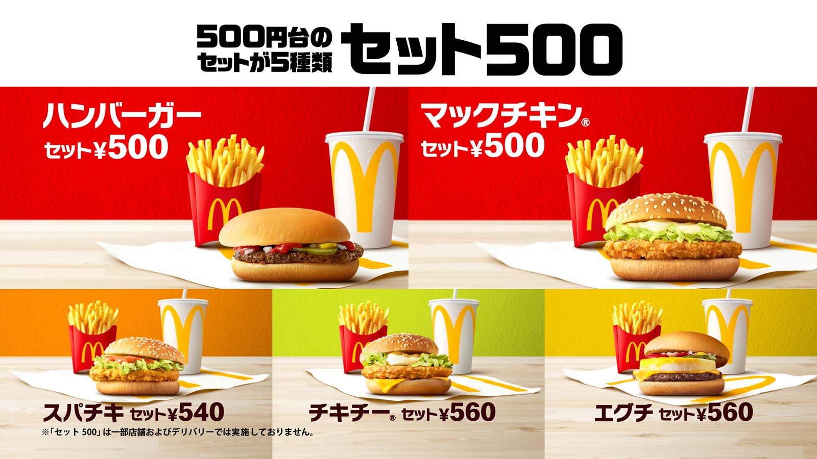 マクドナルドでは3月12日より、500円台のバリューセットラインアップに「ハンバーガー」のセットを追加。5つの500円台のラインアップに進化して、新名称「セット500」とすることを発表した。