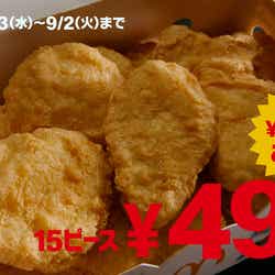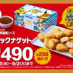 マクドナルドは、人気のサイドメニュー「チキンマックナゲット15ピース(ソース3個付き)」を490円(通常価格:740円~)で販売する「トクニナルド」キャンペーンを7月23日から9月2日までの6週間限定で実施。ポケモンとタイアップした3種のオリジナルパッケージ(数量限定)で提供される。