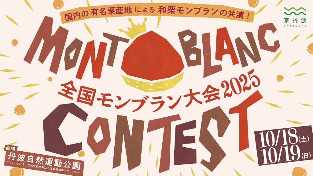 「京丹波マルシェ2025」の一環で、全国の栗の名産地によるモンブランが集う「全国モンブラン大会2025」が、2025年10月18日(土)・19日(日)の2日間、丹波自然運動公園(京都・船井郡)で開催されます。栗好きにはたまらない、産地の個性を味わうイベントです。