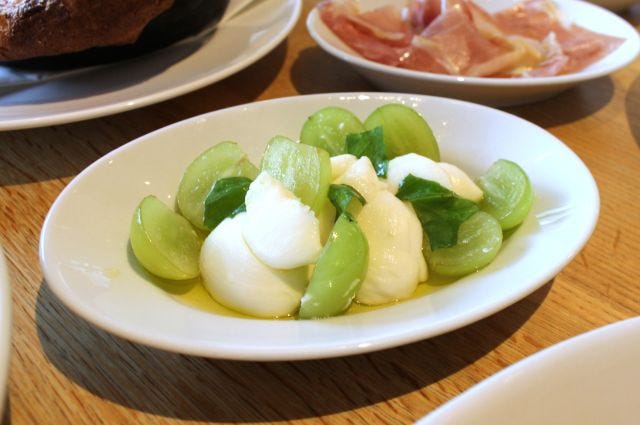 さらに、鹿児島・ふくどめ小牧場の生ハム「クラテッロ」は、しっとりとした食感と深い旨みがワインと好相性。「シャインマスカットとモッツァレラのカプレーゼ」は、丹波の生乳で作るフレッシュチーズが果実の甘みを引き立てます。カプレーゼは季節によって合わせる素材が変わるそうです。