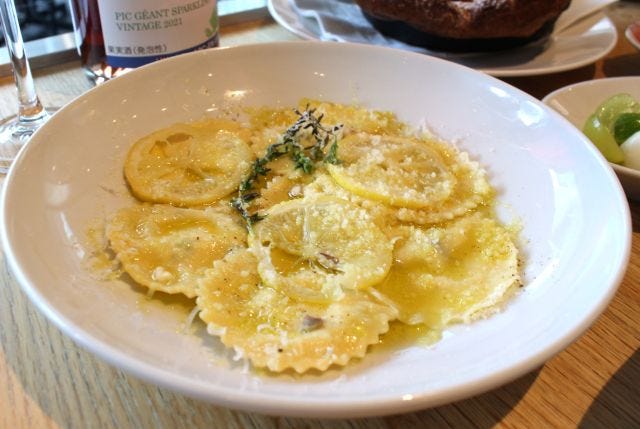 注目は京都産小麦とイタリア産小麦をブレンドし、生パスタならではの食感にこだわった自家製ラビオリ。濃厚なリコッタチーズとハーブなどをパスタ麺で包んだ自慢の一品です。レモンの香りと酸味がきいたバターソースは、思いのほか軽やか。