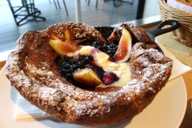 締めくくりには、外はカリッ、中はモチモチの「ダッチベイビーパンケーキ 季節のフルーツ&マスカルポーネ」を。ブルーベリーソースとチーズの酸味が絶妙に調和します。