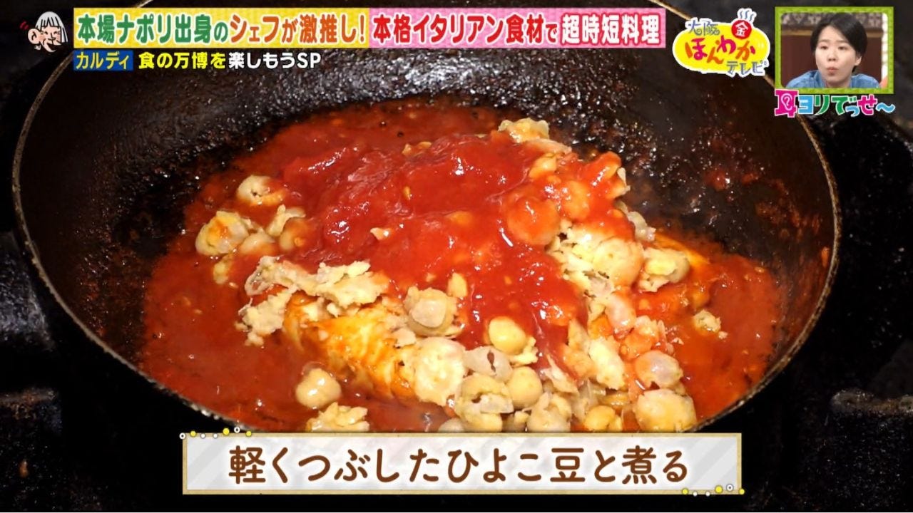 白身魚をソテーし、KALDIのトマト缶と一緒に煮込みます。軽くつぶしたひよこ豆を加え、胡椒で味を調えれば完成。ソースは肉料理や海鮮にもぴったりです。