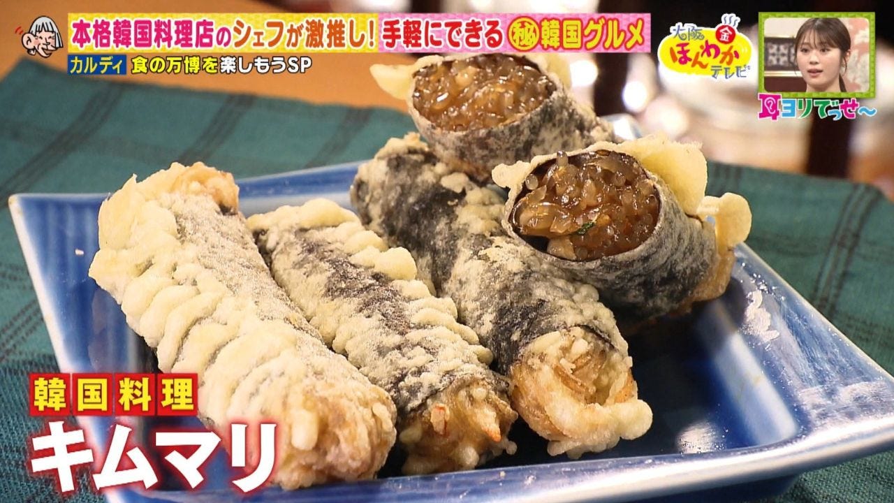 出来上がったチャプチェを海苔で巻き、天ぷら粉をつけて揚げれば「キムマリ」の完成! 先ほどのトッポギソースにつけても絶品です。
