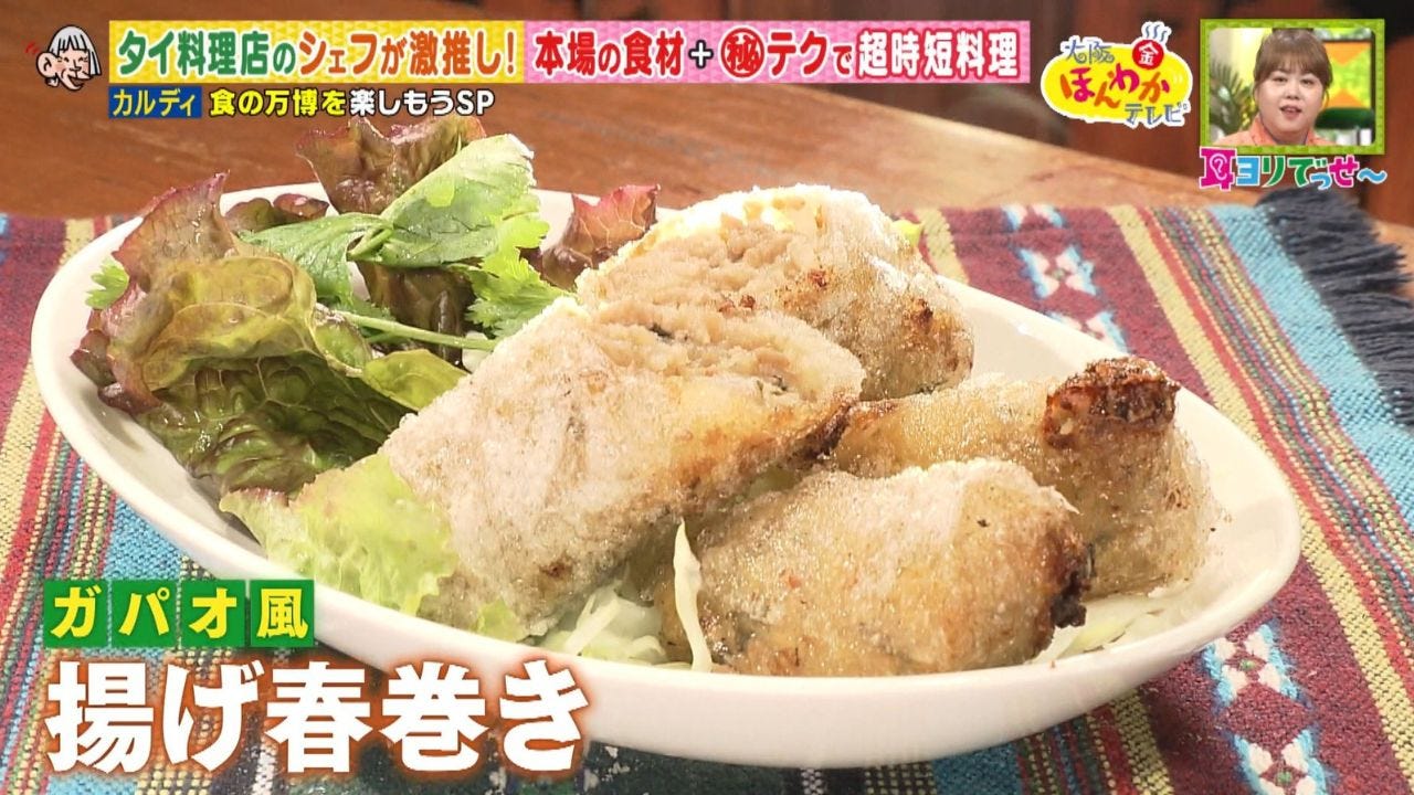 茹でたジャガイモとガパオを混ぜ合わせ、ライスペーパーで包んで揚げれば「ガパオ風揚げ春巻き」に。外はカリッと、中はもちっと。ガパオの辛さがジャガイモでほどよくマイルドになります。