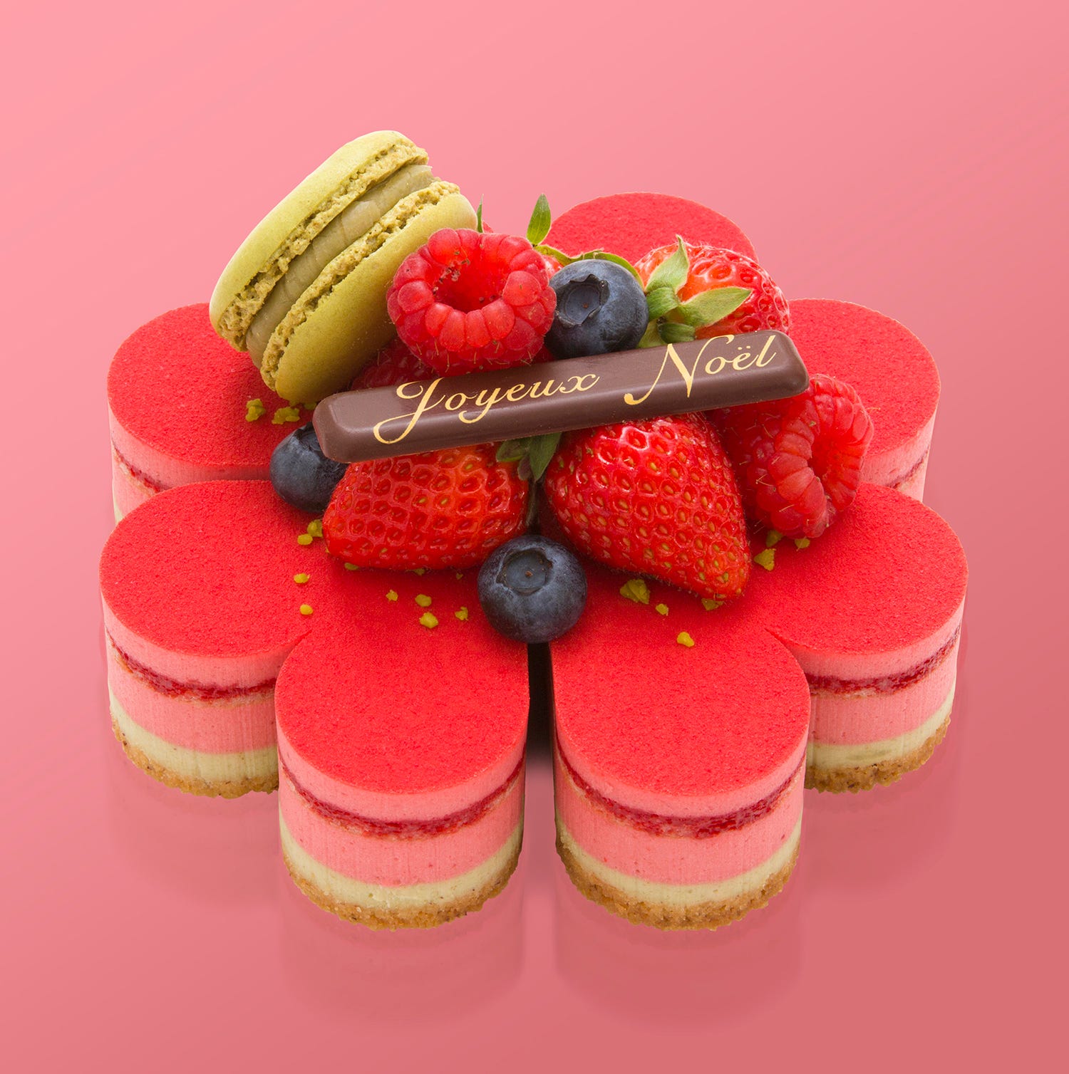 ホワイトチョコレート仕立てのいちごクリームと、コク深いピスタチオクリームの二層が織りなす、華やかなクリスマスケーキ。サクッと軽やかなヘーゼルナッツサブレを土台に重ね、香ばしさとやさしい甘さが絶妙に調和する。花をモチーフにした可憐なデザインと、心弾むようなピンク色がテーブルを明るく彩り、クリスマスのひとときをより特別なものにしてくれる。洋酒不使用のため、小さな子どもとも一緒に楽しめる、親子の笑顔が広がるShinQs限定商品のケーキだ。