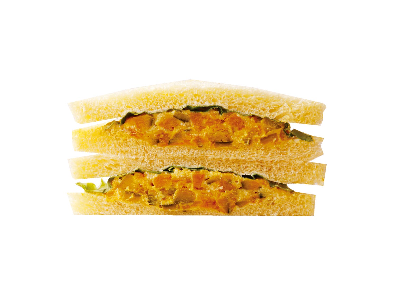 甘さ際立つかぼちゃのマヨネーズあえサラダがたっぷり入った野菜サンド。シャキシャキとした食感のレタスもアクセントになり、味も食感も楽しめる一品。ピクニックや紅葉狩りのお供に、手軽に楽しめるごちそうサンドをぜひチョイスしてみて。