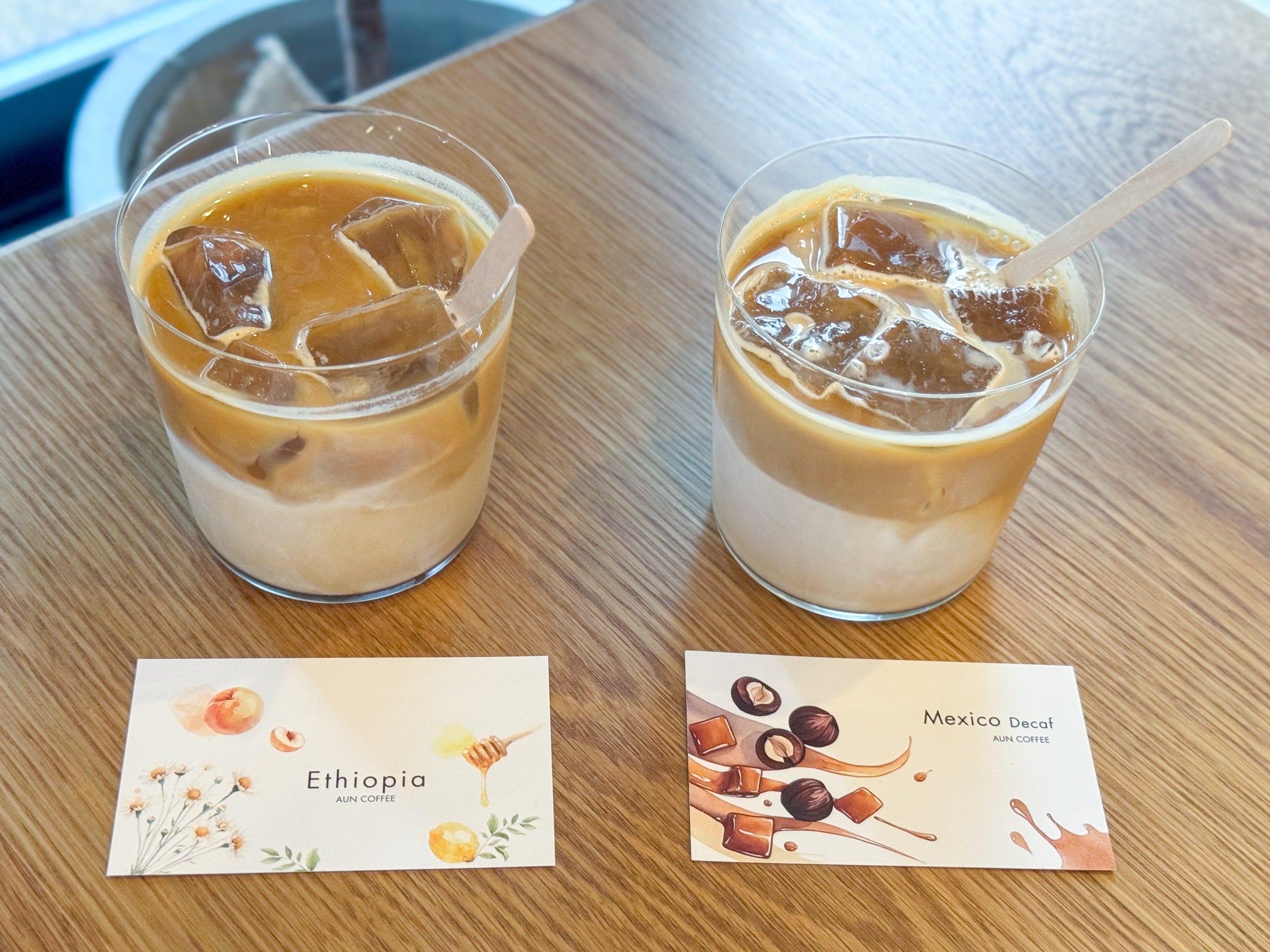 エチオピアの豆を使った「アイスカフェラテ」のLightと、メキシコデカフェの豆を使った「アイスカフェラテ」のLight・デカフェ。同じ「カフェラテ」でも、色味が少し違うのが一目でわかります。