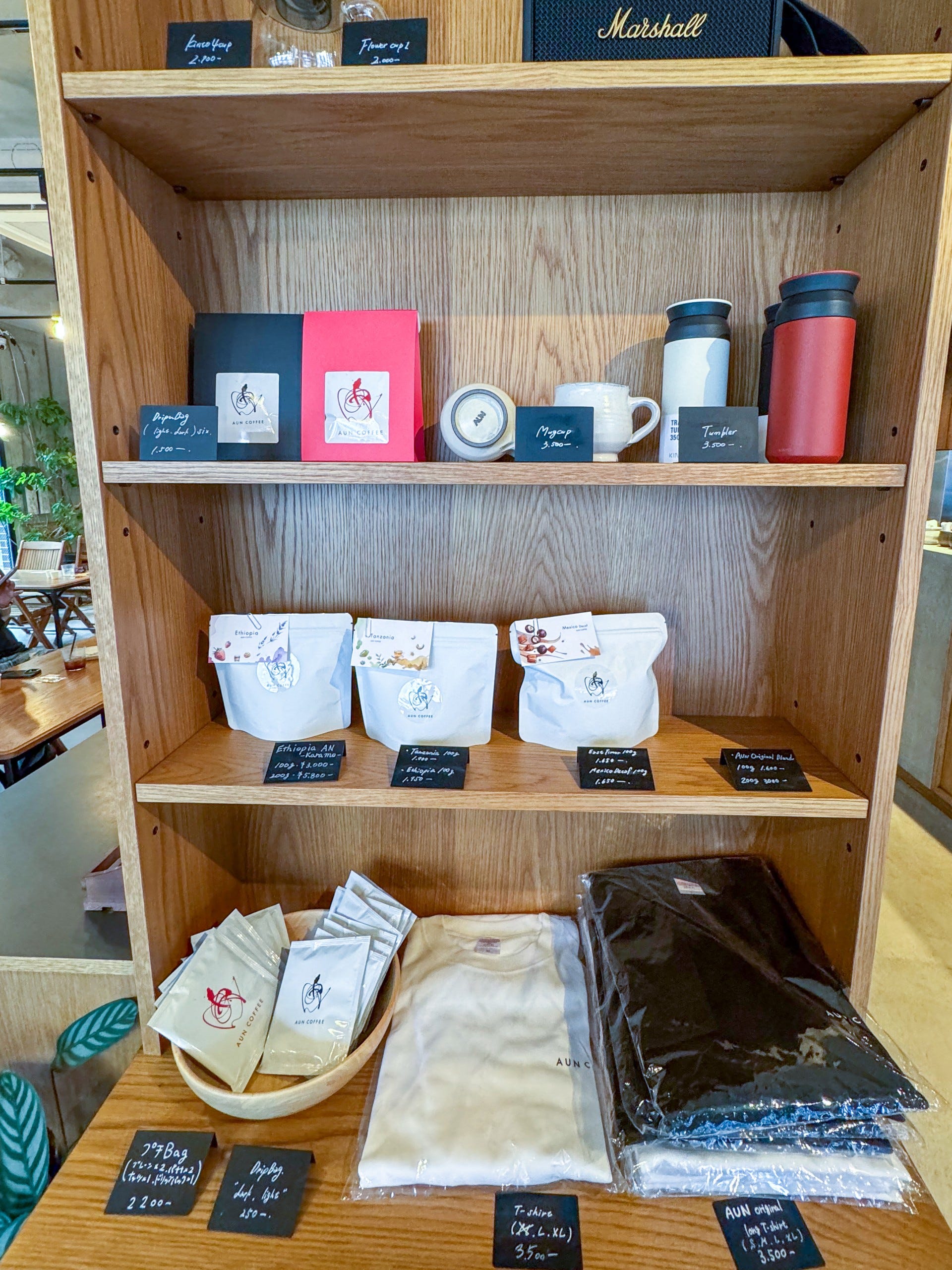 店内では、コーヒー豆はもちろん、マグカップやタンブラーといったオリジナルグッズも販売されています。ロゴ入りで落ち着いたデザインは、ギフトにも自分へのご褒美にもぴったりです。