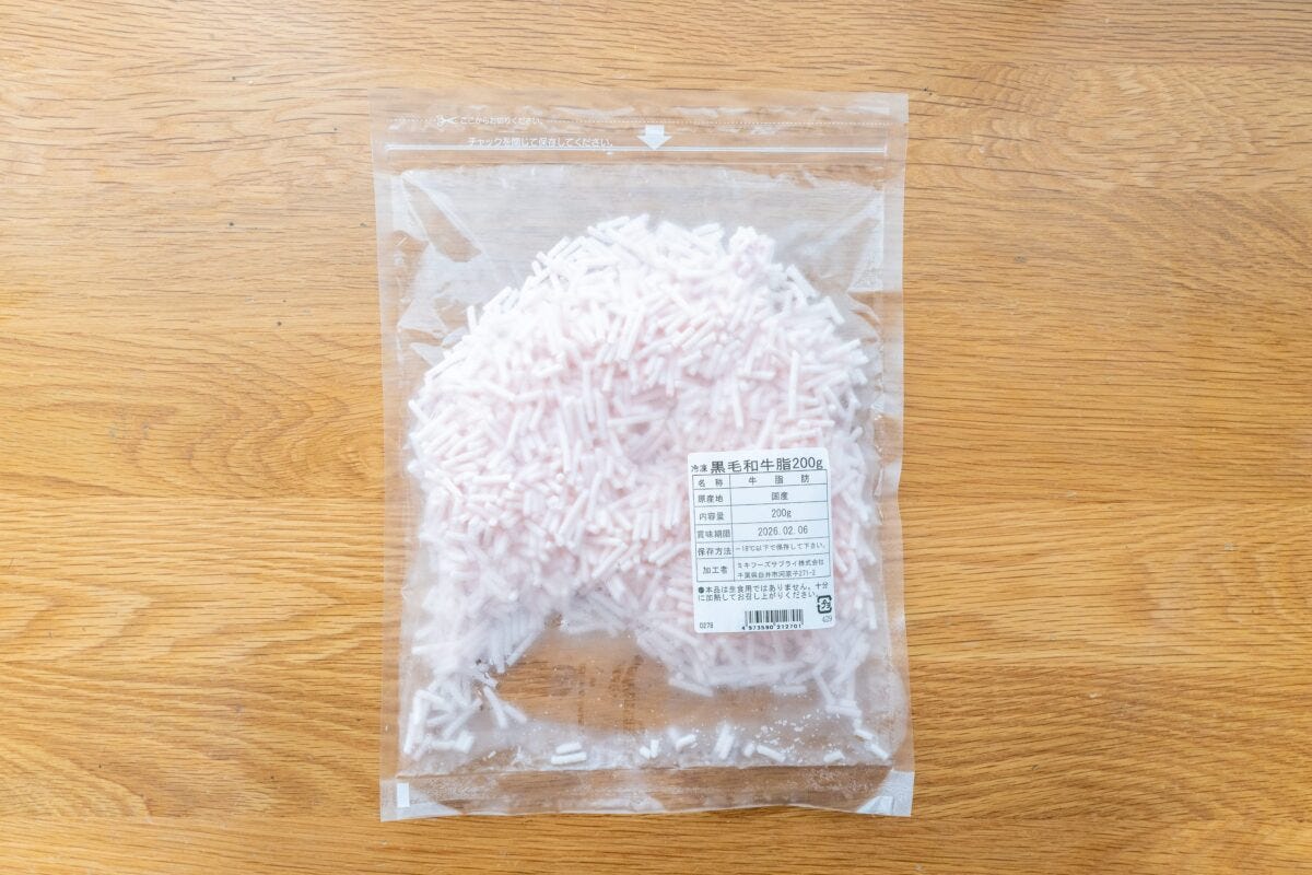「料理にコクがでるパラパラ牛脂」(200g・430円)は、国産和牛の脂を使用。冷凍のミンチ状でジッパータイプの袋なので、毎回使いたい分だけ使用し、残りは冷凍しておけます。