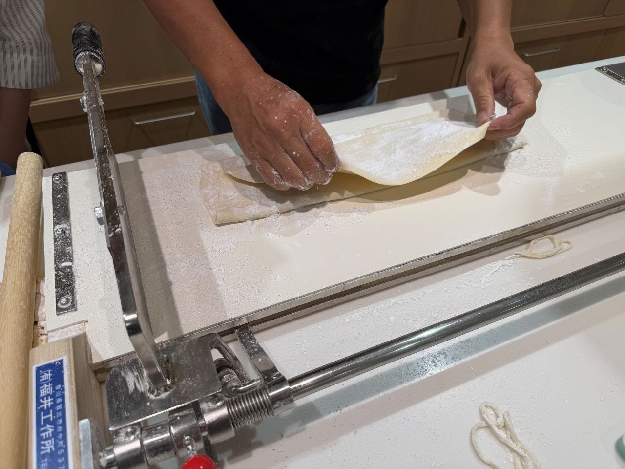 職人が羽織る法被(はっぴ)を着て、店舗でも使用している道具を使って本格的な体験を楽しめます。20年以上の経験を持つ講師が、粉から麺へと生まれ変わるまでを丁寧に伝授。裏話や楽しいエピソードが聞けるかもしれません。