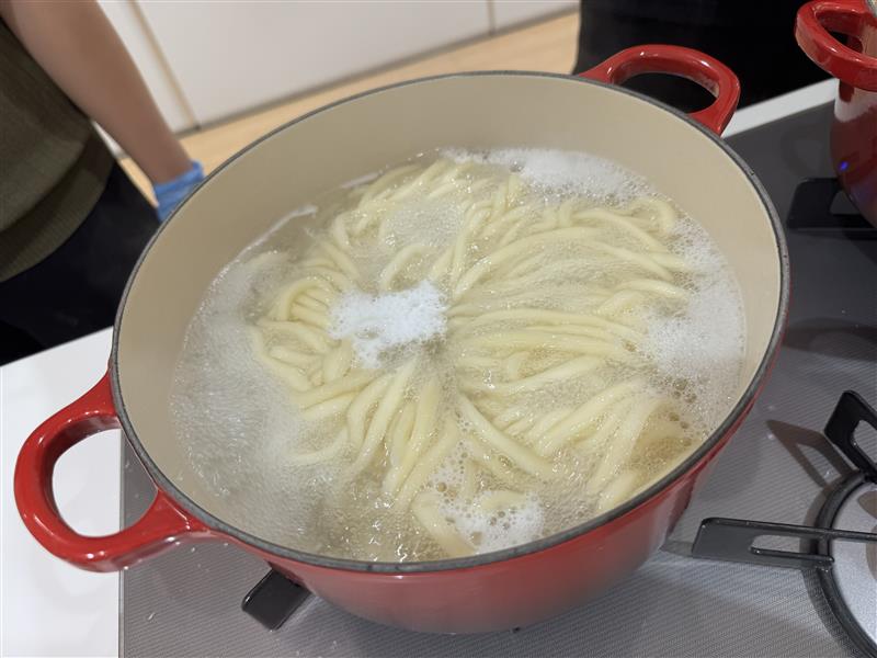 麺の茹で加減を講師にチェック・アドバイスしてもらいながら、モチモチのうどんに仕上げていきます。