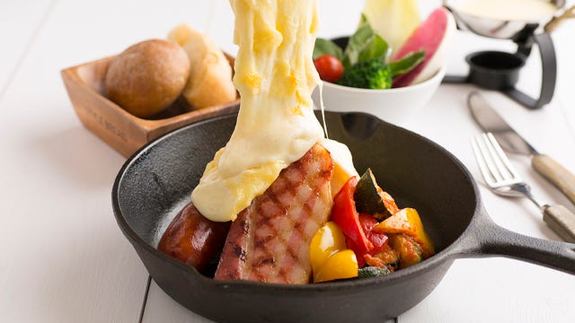 [渋谷ヒカリエ CHEESE KITCHEN RACLER]北海道産ラクレット! Meat & Vege ~ソーセージ&ベーコン&ラタトゥイユ~」/[平日ランチ、平日・土日ディナー)]2,530円(税込)、[土日ランチ]2,728円(税込)