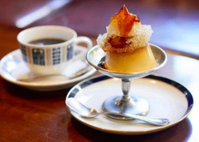 大阪・上本町「喫茶ルプラ」の「プリン」(1個/600円)、「コーヒー」(1杯/550円)