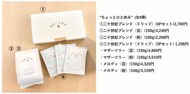 「純喫茶ハンシン」限定アイテム              販売されるのは、厳選された質の良い豆を独自の比率でブレンドした「二十世紀ブレンド」のセットや、「喫茶二十世紀」オンラインストアの人気商品。10月に登場したばかりのアイテムや、「純喫茶ハンシン」限定アイテムもラインナップします。オンラインストアの商品を実際に手に取って見ることができる、貴重な機会です。