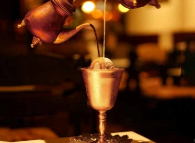 長野・松本「珈琲美学アベ」の「モカクリームオーレ」(1杯/1,000円)※11月1日(土)~11月3日(月・祝)出店     京都・四条烏丸「珈琲の店 雲仙」の「コーヒーとホットケーキのセット」(1人前/1,430円)※11月1日(土)~11月3日(月・祝)出店