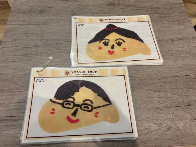店舗入口で代金を支払い、クッキーづくりキットを受け取って体験がスタートします。「クレヨンしんちゃん」「シロ」「ぶりぶりざえもん」のフレームから好みを選んで。また、パパやママの顔など自由に作って、プレゼントにするのもおすすめです。