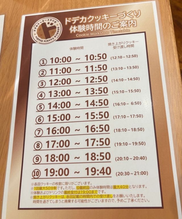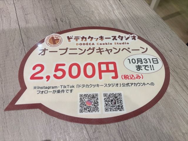 体験受付時間は、10:00~19:00までの全10回を予定。予約制ではないので、店頭で申し込みを。オープニングキャンペーンとして、10月31日(金)までは通常2,800円のところ、2,500円で体験ができます。InstagramやTikTok「ドデカクッキースタジオ」公式アカウントをフォローしてお出かけくださいね。