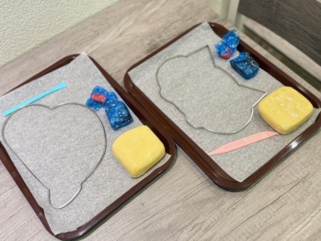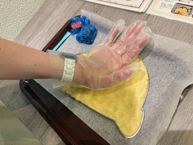 annaでは、「クレヨンしんちゃん」と「ぶりぶりざえもん」をチョイス。見本を参考にしながら、生地を伸ばしていきます。少し力を入れて、均等の厚さに伸ばしていくのがコツ。