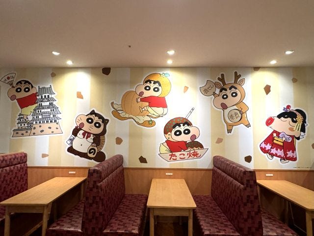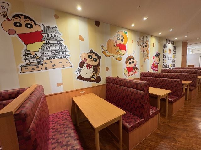 店内の壁には、近畿の各県をイメージしたしんちゃんのイラストが描かれ、ボックスシートや、2人がけのテーブル&チェアを備えた広々とした空間。一度に44枚のクッキーづくり体験ができ、親子やグループでゆったり楽しめます。