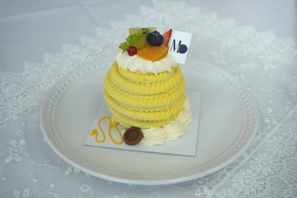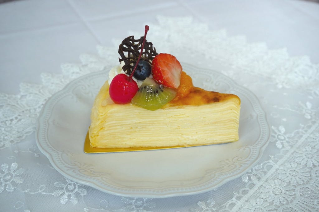 「カサネオ」の「プリンアラモード ミルクレープ」(1個/702円)              本企画の目玉は“プリン・ア・ラ・モード”。「阪急うめだ本店」地下1階の洋菓子売り場では、「フリュテリー果坊」の「昔ながらの喫茶プリン・ア・ラ・モード」や「クラブハリエ」の「パイバーガー プリンアラモード」など、王道からネオまで個性豊かなプリン・ア・ラ・モードがそろいます。
