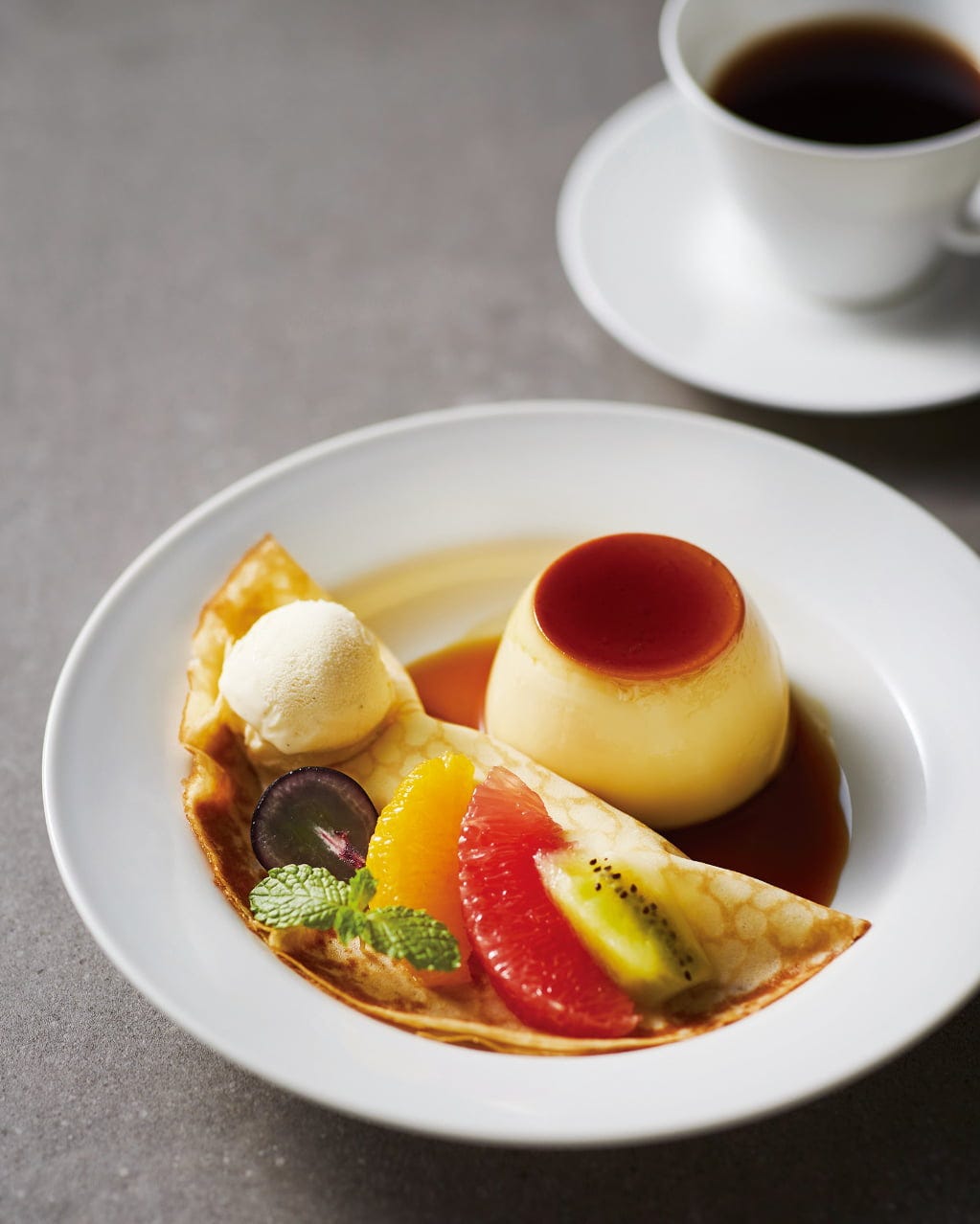 「カフェ モロゾフ」の「クレープのプリンアラモードとお飲物」(1人前/1,540円)     「クラビ バイ チェディルアン」の「ココナッツプリンアラモード」(1人前/948円)