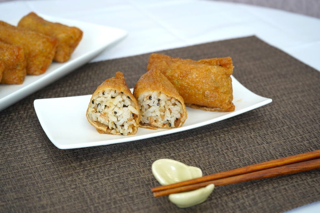 「豆狸」の「復刻いなり」(1個/195円)     「つの田の牛めし」の「大人向けお子様ランチプレート」(1人前/1,296円)