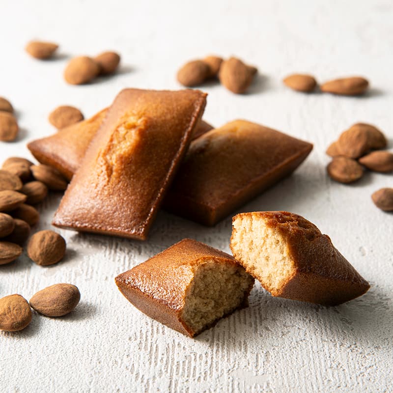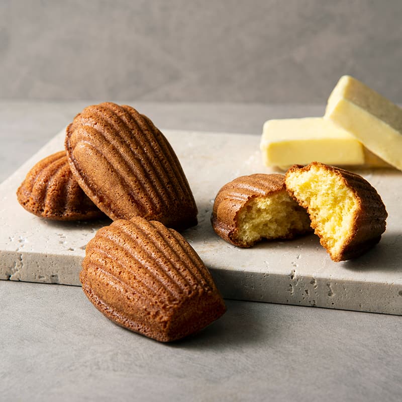 「発酵バターのマドレーヌ」(300円~) 「発酵バターのフィナンシェ」は、ひと手間かけて焦がしバターにしたフランス産発酵バターと、スペイン産マルコナ種アーモンドを50%ブレンドしたアーモンドプードルを使用。しっとりとした口当たり、ふんわり食感の「発酵バターのマドレーヌ」は、アーモンドパウダーのうまみに、レモンの香りがさわやかな余韻を残します。
