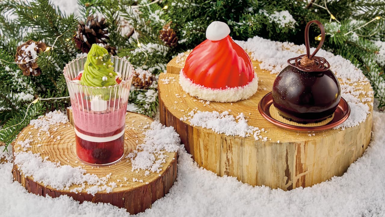 (左)「クリスマス・パフェ ~ベリー&ピスタチオ~」、(真ん中)「サンタクロース ~キャラメル&ラズベリー~」、(右)「ムース・オ・ショコラ ~オランジェ&カルダモン~」 さらに、「ビバリーヒルズ・ブランジェリー」では艶やかでアートのようなクリスマスケーキが今年も3種類登場! パークでしか体験できない高揚感とレストランで味わう落ち着きの時間をシーンに合わせて楽しむことができます。クリスマス限定メニューを注文するともらえる、オリジナルの「ごちそうフェス・ステッカー」にも注目です。