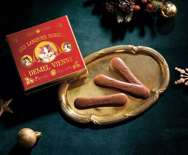 デメル「ソリッドチョコ猫ラベルミルク(クリスマスラベル)」(105g/2,592円) ※400個限り 2025年11月5日(水)には、「デメル」が京都地区初お目見え。定番人気の猫の舌をモチーフにしたなめらかなミルクチョコレートが、クリスマス限定パッケージで登場します。