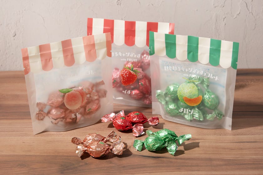 [メリーチョコレート]はじけるキャンディチョコレートwith FRUIT (モモ、イチゴ、メロン)/各1袋 594円(税込)