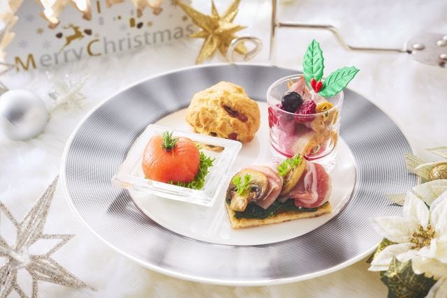 メニュー:オードブル/スープ/メインディッシュ/クリスマス アフタヌーンティー ~雪の女王とサンタクロースからの贈り物~ スイーツ2段/コーヒーまたは紅茶