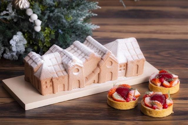 <中段>上段左側から時計回りに、ソリをイメージした「チョコレートモンブラン」、アールグレイとオレンジクリームが調和する「紅茶のカヌレ」、「ドバイチョコ」、洋梨とチョコレートの「米粉パウンドケーキ」、「リース風クッキー」 ウェルカムティーには、ハイビスカス、リンゴ、ラズベリーなどがブレンドされた、ロンネフェルトのフレーバーフルーツティー「ウィンターハーモニー」を。スイーツは、煙突に見立てた「バナナカスタードシュー」や、王道の「ショートケーキ」、トナカイが引くソリを想わせる「チョコレートモンブラン」、オレンジがアクセントの「紅茶のカヌレ」など華やかなスイーツがそろいます。