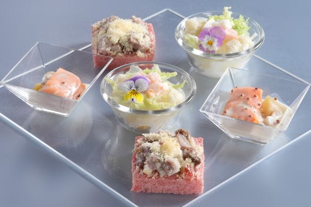 <下段>上側左側から時計回りに「リンゴとはちみつのスコーン」、「スモーク鴨 ベリーバルサミコソース添え」、トリュフがほのかに香る「ほうれん草ときのこのキッシュ」、クリームチーズを包んだ「スモークサーモンボール」 セイヴォリーは、生ハムやトリュフがアクセントとなったクリスピーな食感の「ほうれん草ときのこのキッシュ」、まろやかなクリームチーズと爽やかなレモンドレッシングを合わせた「スモークサーモンボール」など、こだわりのメニューが登場します。