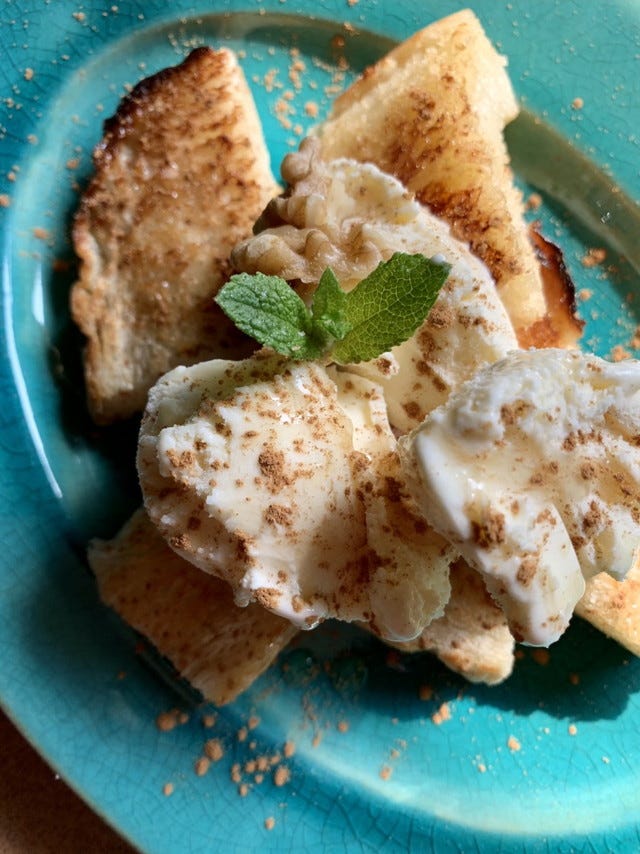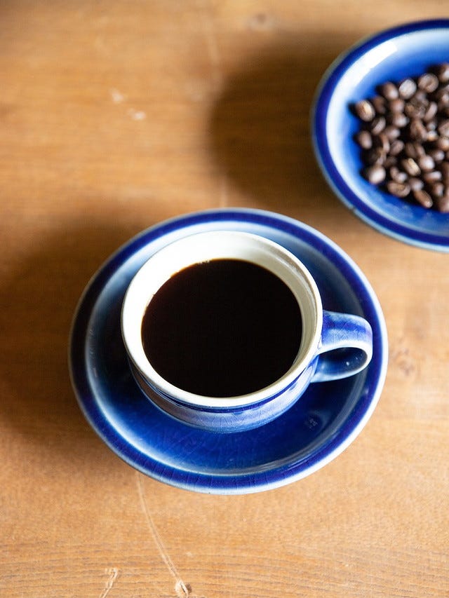 (左)「本日のコーヒー」600円。2杯目からは350円とお得に注文できます。(右)アツアツのトーストの上にアイスクリームが乗った「ハニートーストアイス乗せ」850円。 「山粋」のもうひとつのお楽しみが、店主こだわりのコーヒーと軽食。コーヒー豆は手回しの焙煎機で自家焙煎しており、エチオピア、ケニア、グアテマラなど常時3、4種の豆がスタンバイ。水には豊能町内の山の湧き水を使い、ここでしか味わえない一杯に仕上がっています。