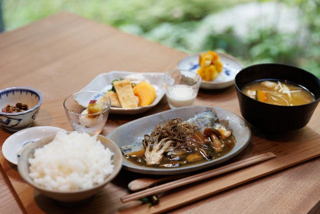 「旬の野菜の発酵御膳(魚)」2,500円/魚の主菜(鯖の木の子たっぷりお出汁餡かけ)、副菜2種、甘糀ドリンク、甘味、季節のお味噌汁、ごはんのおとも、自家製漬物、釜炊きの炊き立てごはん 施設の1階には、数々の発酵料理を使った和食ランチが味わえる「孚(ふぅ)」がお待ちかね。おすすめの「発酵御膳」は季節替わりのメインを肉料理・魚料理から選べるほか、副菜やお味噌汁などにはそのときの旬の食材を使った一品が勢ぞろい。釜炊きのごはんは、席で釜からお茶碗によそってくれる心遣いもうれしいポイントです。