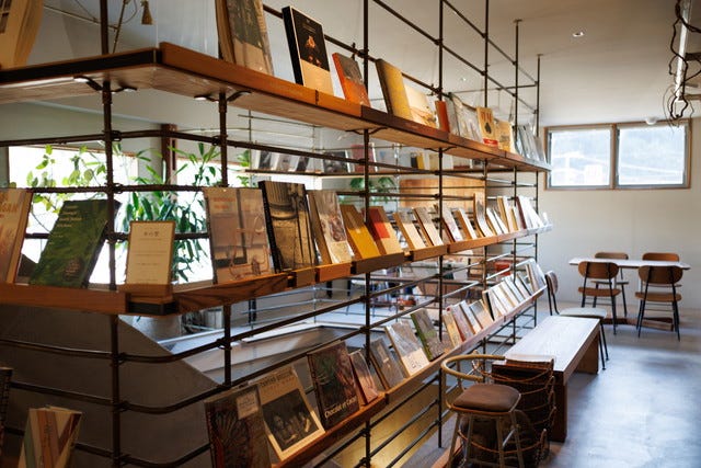 2階の吹き抜けには、約200冊の本が並ぶ「Book Wall(本の壁)」がドン! “LIFE”をテーマに小説や画集、絵本などがそろい、「閑日」でメニューを注文すれば席で本が読めるほか、購入もできます。