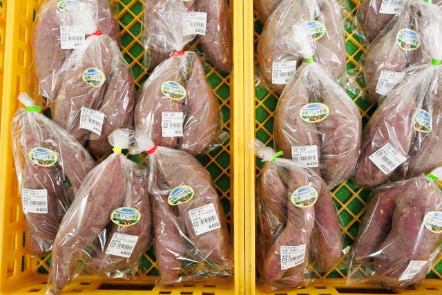能勢ブランド野菜のひとつ「べにはるか(さつまいも)」。その甘さやほくほく感を満喫できる焼き芋をはじめ、大学芋や天ぷらにも最適です。