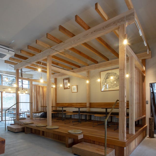 2階のカフェ「閑日」では、太陽光が差し込む明るい広々とした空間から、まるで東屋のような木造りが美しい小上がりまで、好きな場所を選んで滞在を。ここでは「スキレットランチセット」や「ピザランチセット」といった洋食ランチがいただけるほか、季節のスイーツとともにのんびりと過ごすことができます。