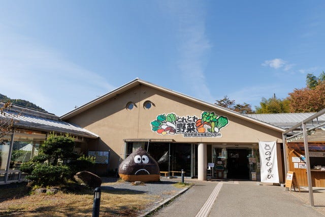 ドーンと大きな栗のモニュメントが目印。 旅の最初に訪れておきたいのが「道の駅 能勢(くりの郷)」。残念ながら名物の栗や黒枝豆のシーズンは終わっていますが、おうちの食卓をおいしくぽかぽかにしてくれる旬野菜や加工品、スイーツ、おみやげなどがずらりと並びます。
