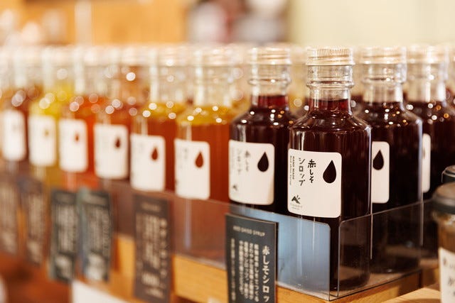 赤しそやゆず、いちご、うめ、メロン、ジンジャーなど多彩にそろうシロップ。その日の気分に合わせてお湯割りや炭酸割りなどで楽しんで。