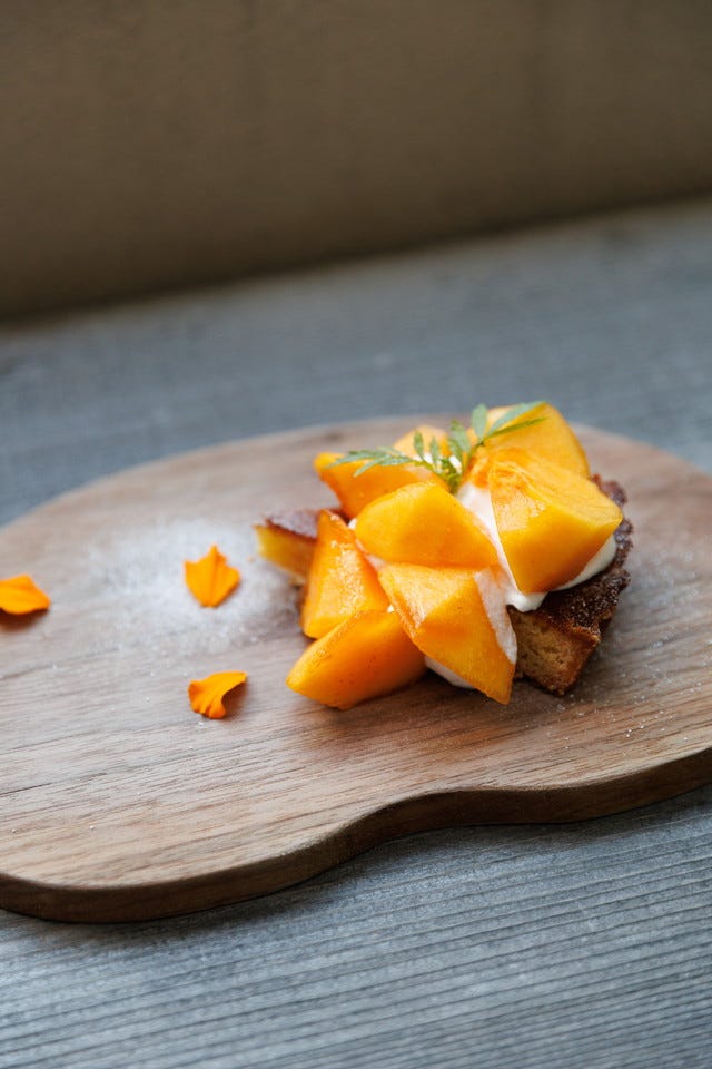 (左)「奈良県五條産なだれ柿の米粉タルト」880円、(右)「季節のフルーツティー(HOT/ICE)680円 季節の米粉タルトは、秋が旬の柿を使用。シンプルでベーシックな味わいのタルト生地に甘さ控えめの生クリームを盛り付け、さらに甘い柿をこぼれるほどトッピングしています。