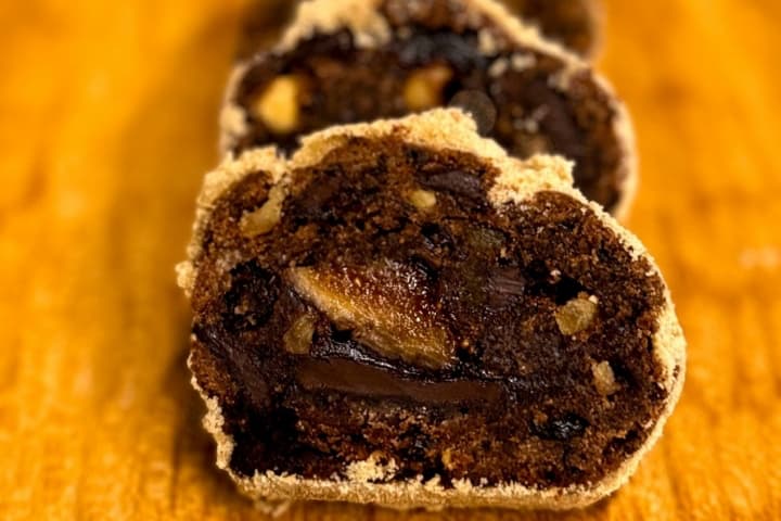 「シュトーレン ショコラ」(1本/2,901円、ハーフ/1,541円、カット/341円) 肉厚で味わい深い甘みのある“モハベレーズン”や6種類のドライフルーツと3種類のナッツをラム酒に漬け込んだシュトーレンが自慢の「パティスリーパレットローヴ」。「シュトーレン ショコラ」には、スペイン産チョコレートが生地に練り込まれています。
