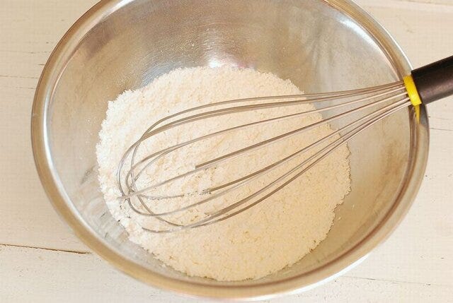 ボウルに薄力粉と砂糖、塩、シナモンパウダーを入れ、泡立て器でざっと混ぜ合わせる。