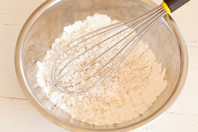 オートミールを加え、泡立て器でざっと混ぜ合わせる。