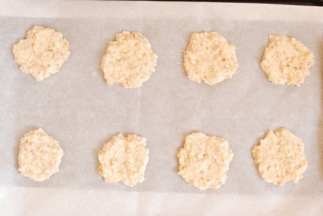 クッキングシートを敷いた天板に、生地をスプーンでのせ平らに広げる。