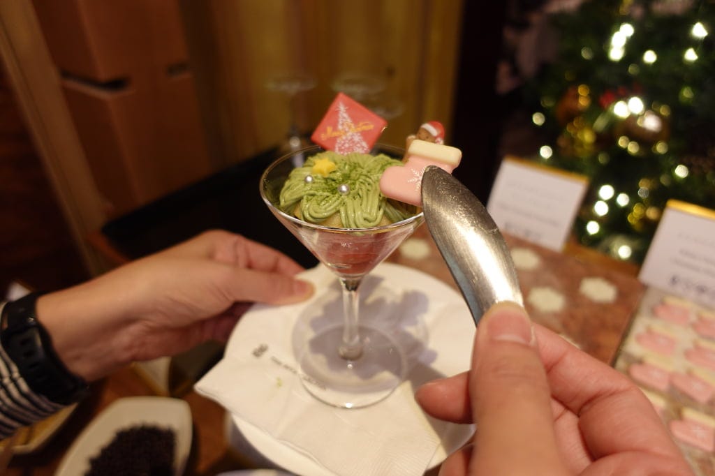 フロアのセンターにあるショーケースの中には、小皿にのせたミニスイーツがずらり。取りやすく食べやすく、見た目にもかわいいサイズ感です。サンタクロースやリース、雪だるまなど、クリスマスや冬のモチーフがあしらわれ、見ているだけでもワクワクします。