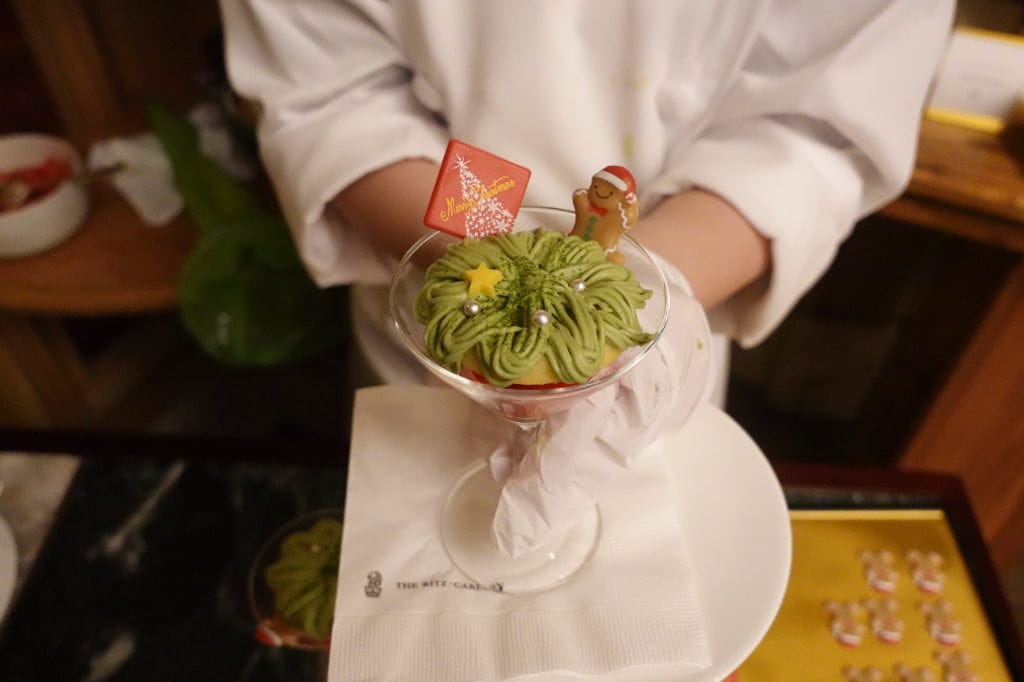 パティシエが目の前で仕上げてくれるライブデザート「ピスタチオクリームとストロベリーゼリーのクリスマスリース」。いちごゼリーの上にドーナツ型のパンケーキのような生地をのせ、そこにピスタチオと抹茶をブレンドしたクリームを絞ったミニパフェです。