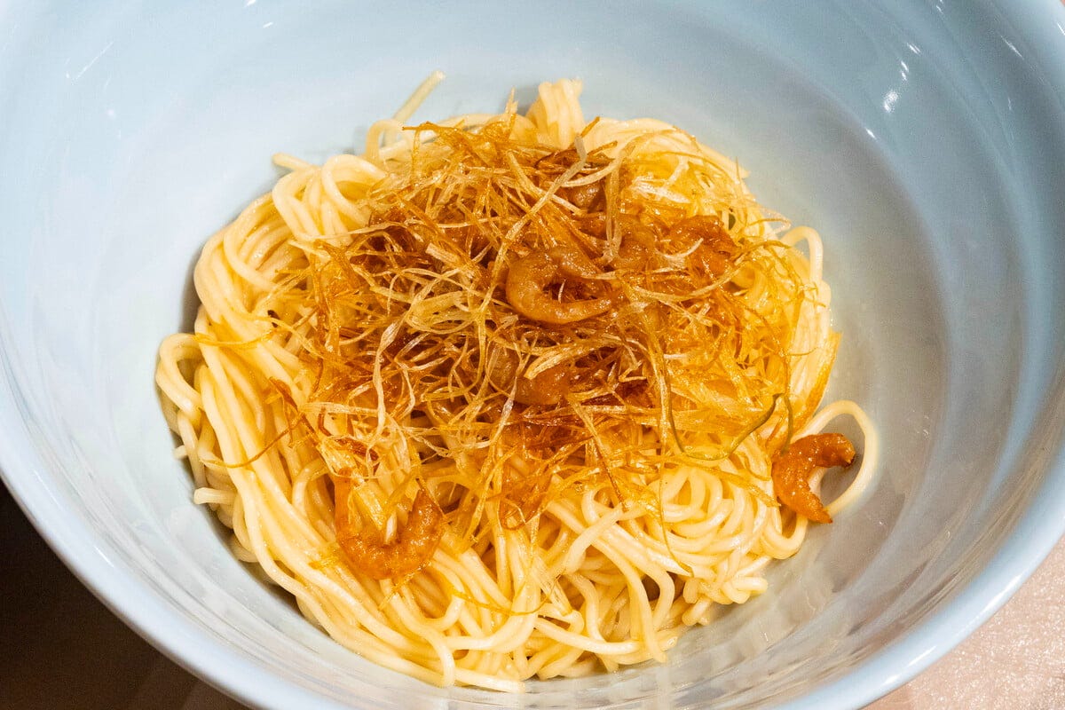 「特製ネギ油和え麺」(580円) 醤油などを使ったタレに一晩漬け込んだ豚ロースを素揚げした「豚カツチャーハン」や「特製ネギ油和え麺」などシメ系のメニューも豊富にそろっています。