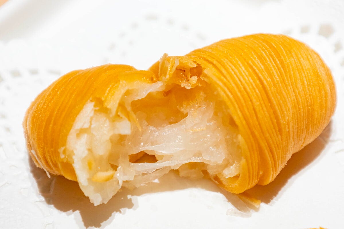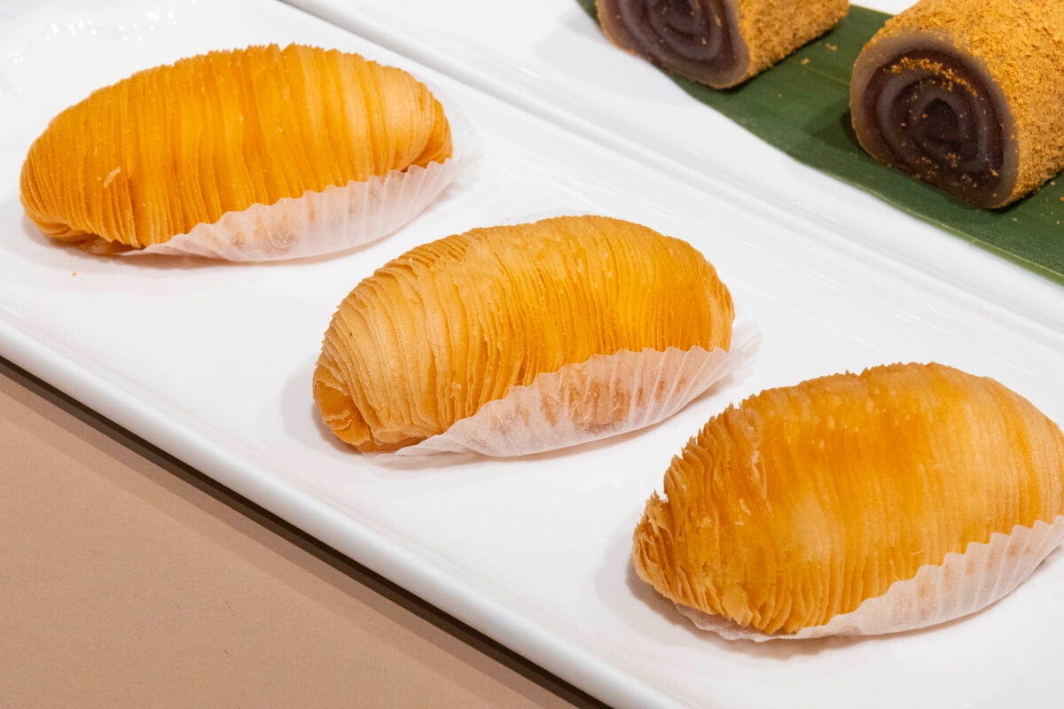 「もち米ときな粉の宮廷菓子」(620円/3個) さらにスイーツも充実。カスタードとタロイモ、2種の味が楽しめる「特製・二色まんじゅう」や豆から挽いたきなこをつかった「もち米ときな粉の宮廷菓子」など、たくさんのメニューが待っています。